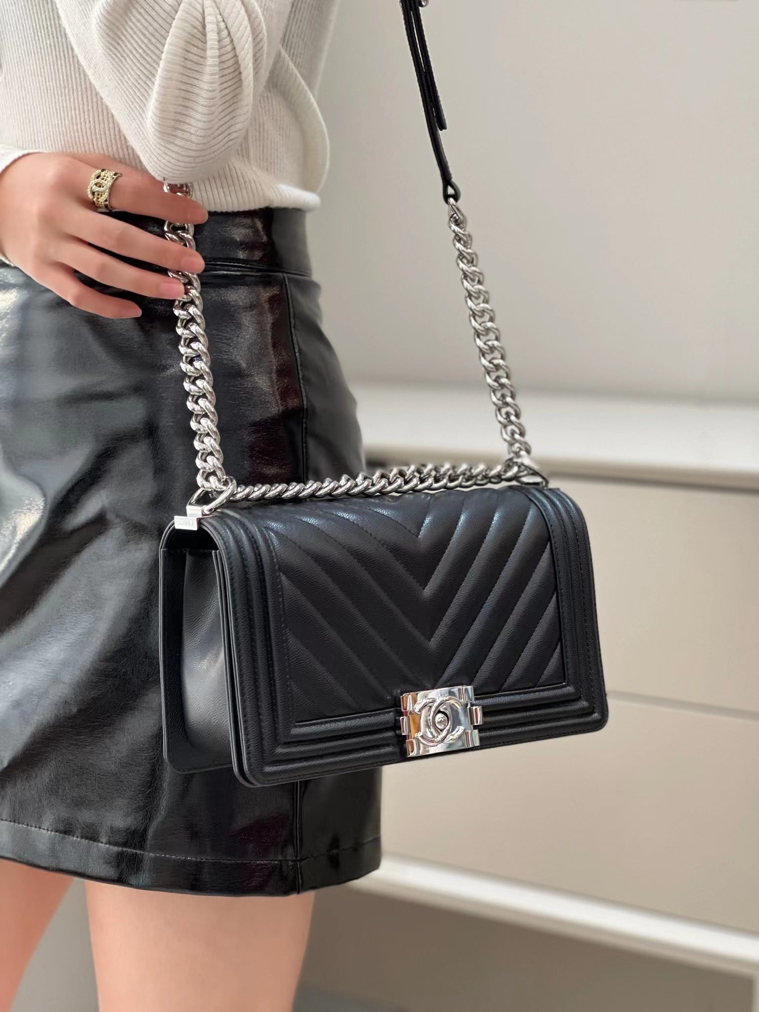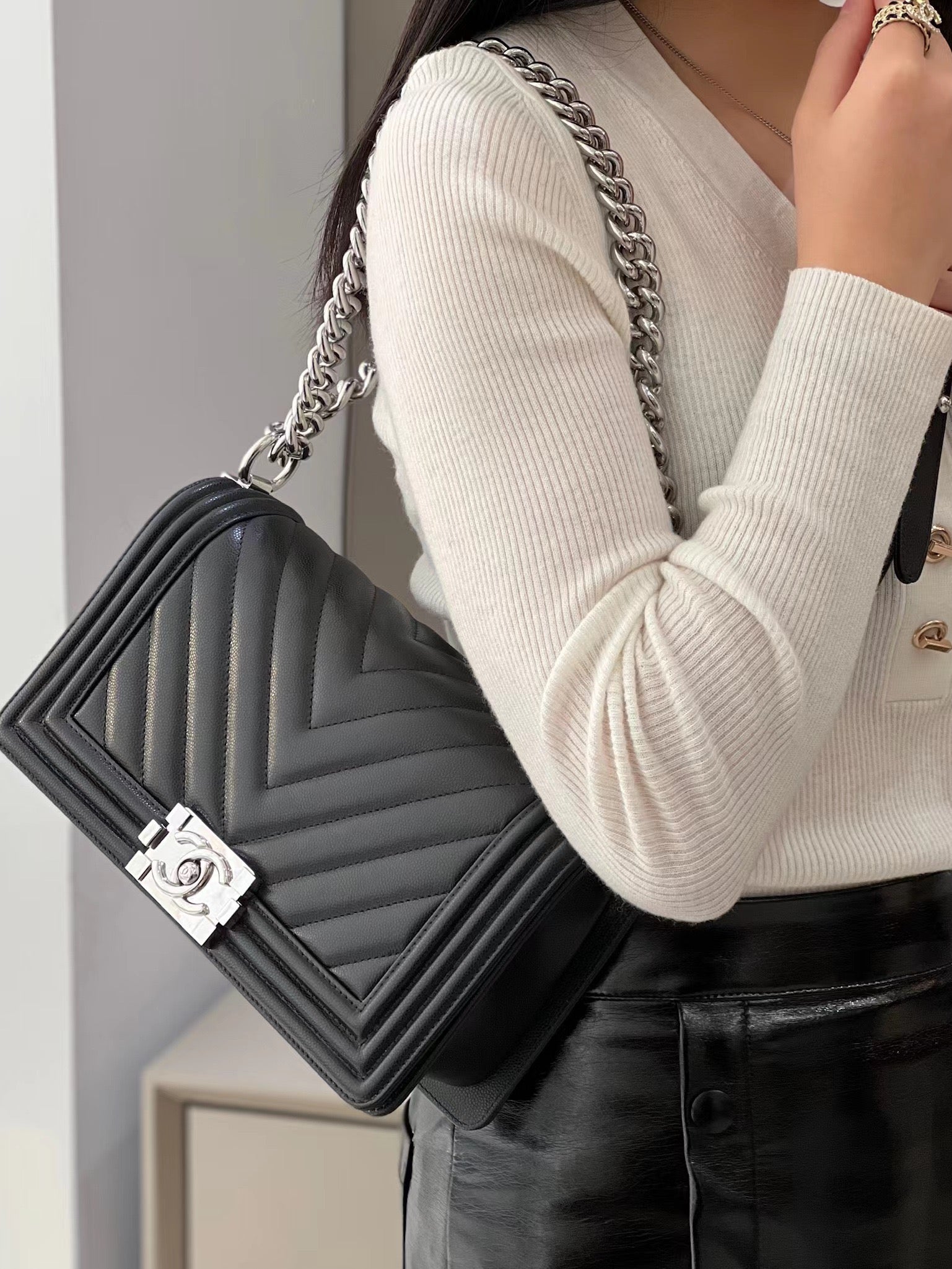 CH BOY HANDBAG 25 Small Grained Calfskin V Pattern Black