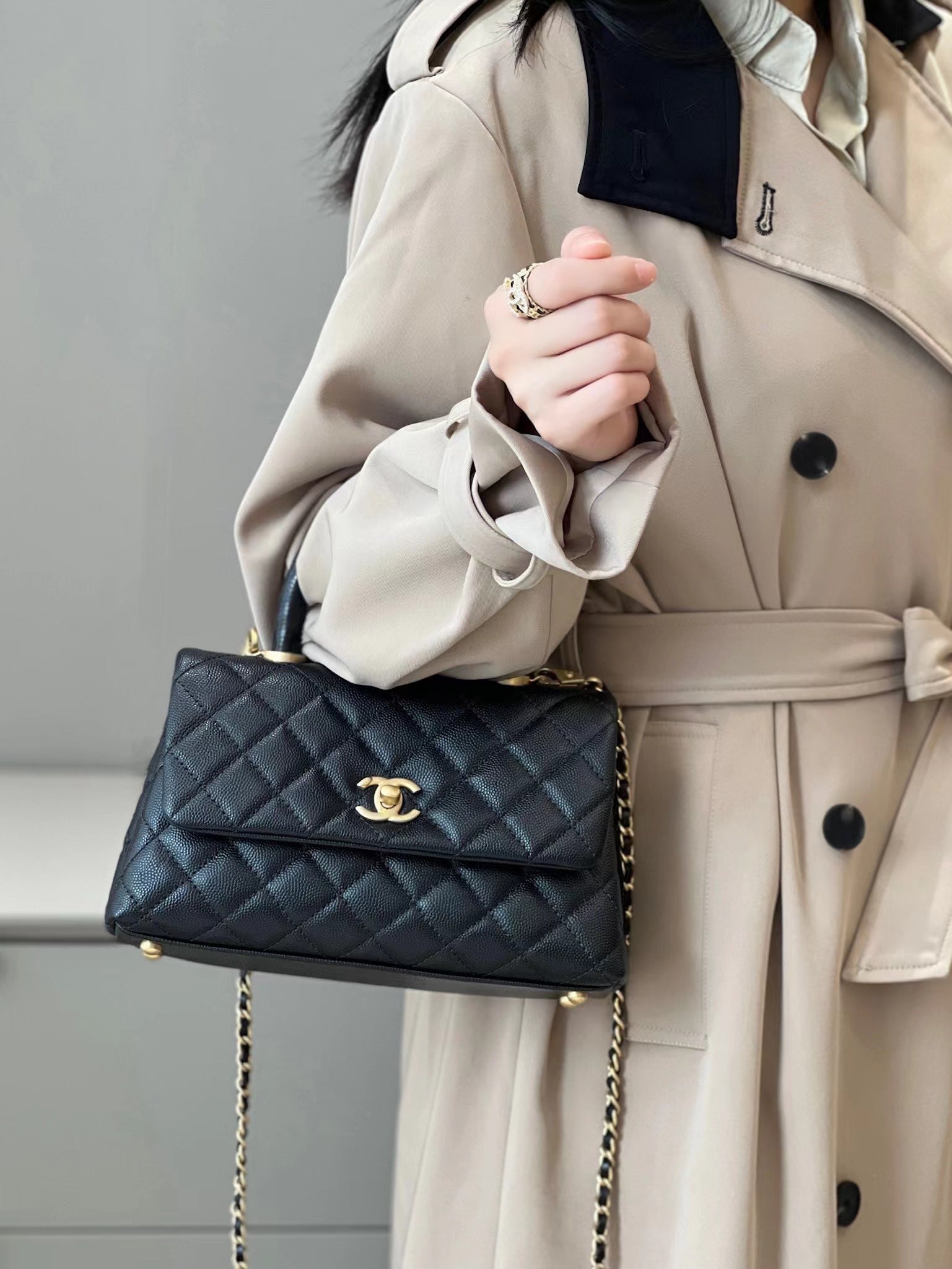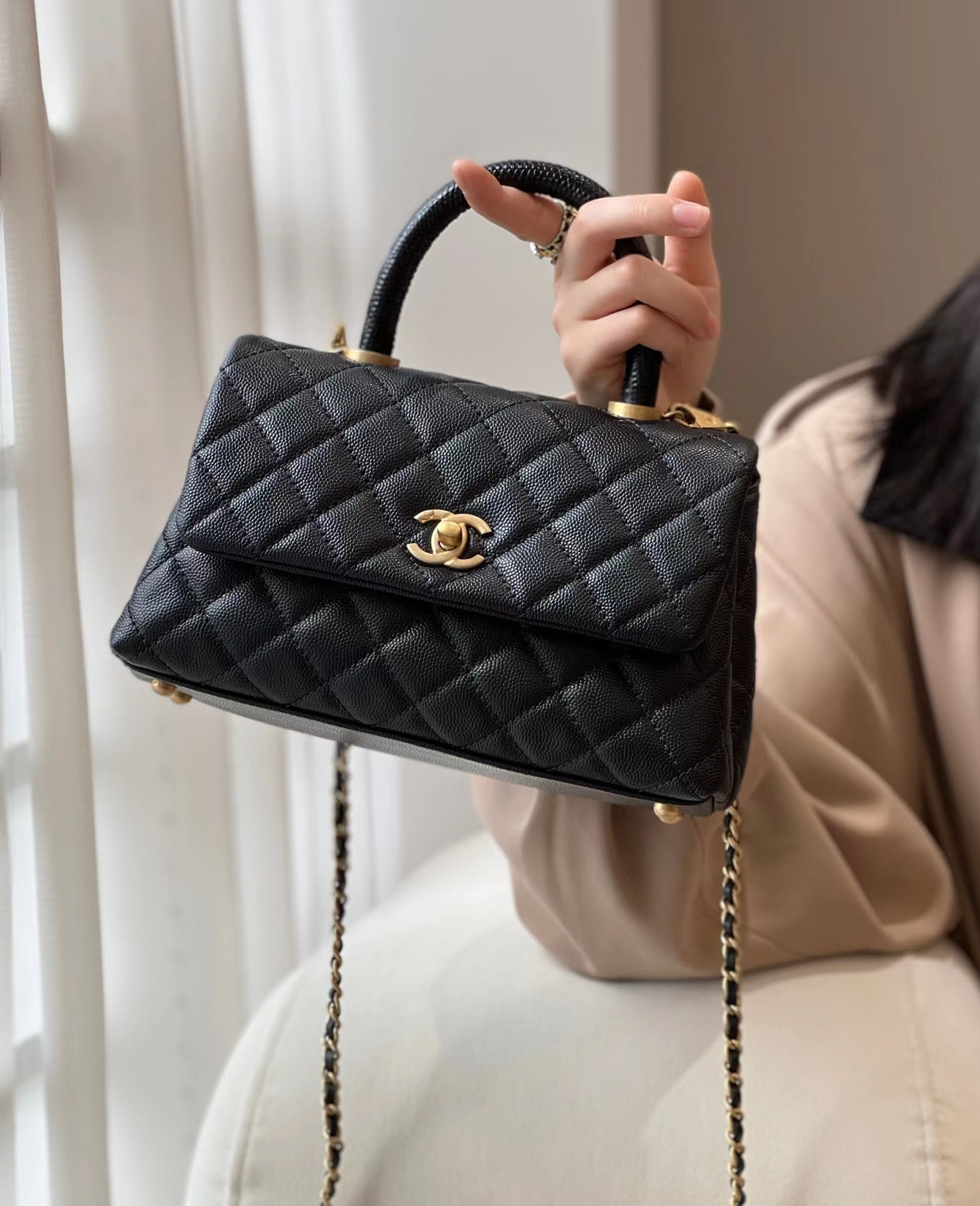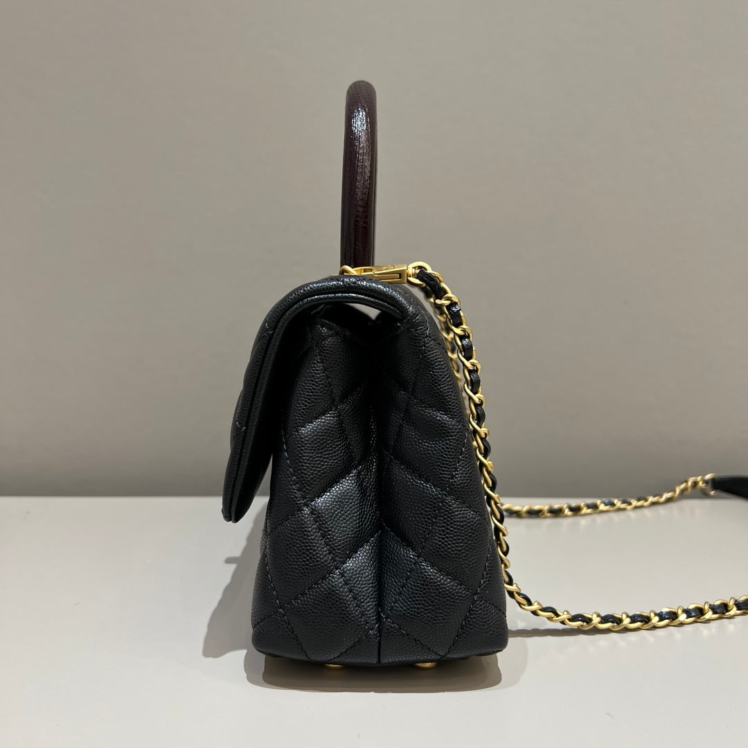 CH FLAP BAG WITH TOP HANDLE 24 Small Grained Calfskin Lizard Handle Black